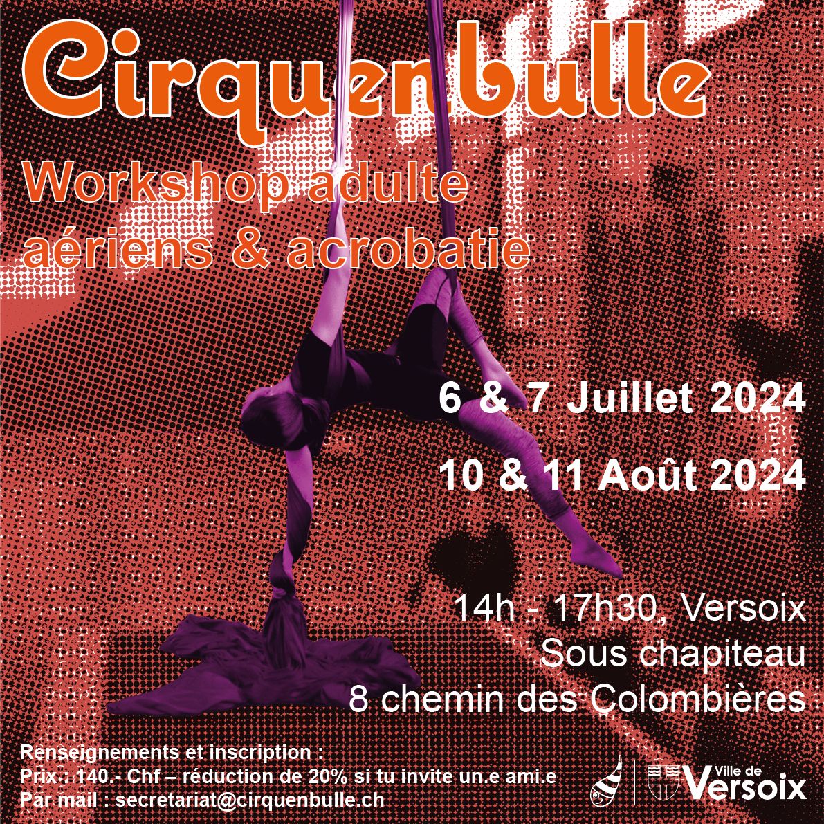 Cirquenbulle organise sur les weekends du 6 & 7 Juillet ainsi que celui du 10 & 11 Aôut de 14h à 17h30 des Workshops à destination des ados et des adultes.
