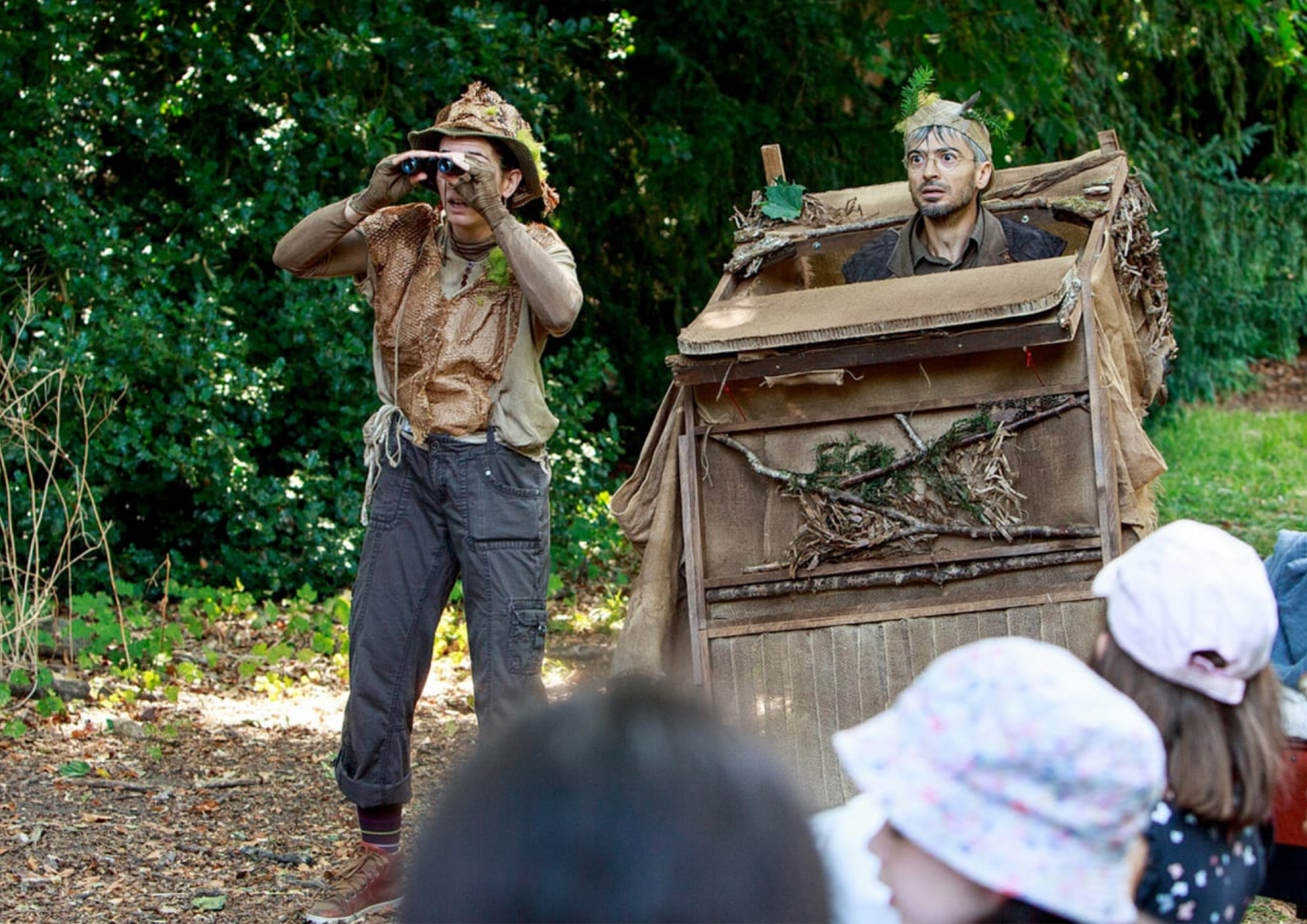 Des personnages clownesques partent explorer la nature… sans rien voir, au début. En regardant de plus près, un monde caché se révèle sous nos pieds.